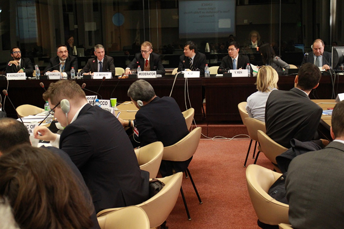 2016年10月20日﹒日內(nèi)瓦萬國宮,聯(lián)合國歐洲經(jīng)濟委員會PPP專家委員會會議:城市軌道交通PPP國際標(biāo)準(zhǔn)研究專家組長--中咨公司研究中心主任李開孟博士(左起第五)與鐵路PPP國際標(biāo)準(zhǔn)研究專家組長--CMS律師事務(wù)所英國總部PPP全球業(yè)務(wù)負(fù)責(zé)人Jonathan Beckitt(左起第三)在主席臺上。